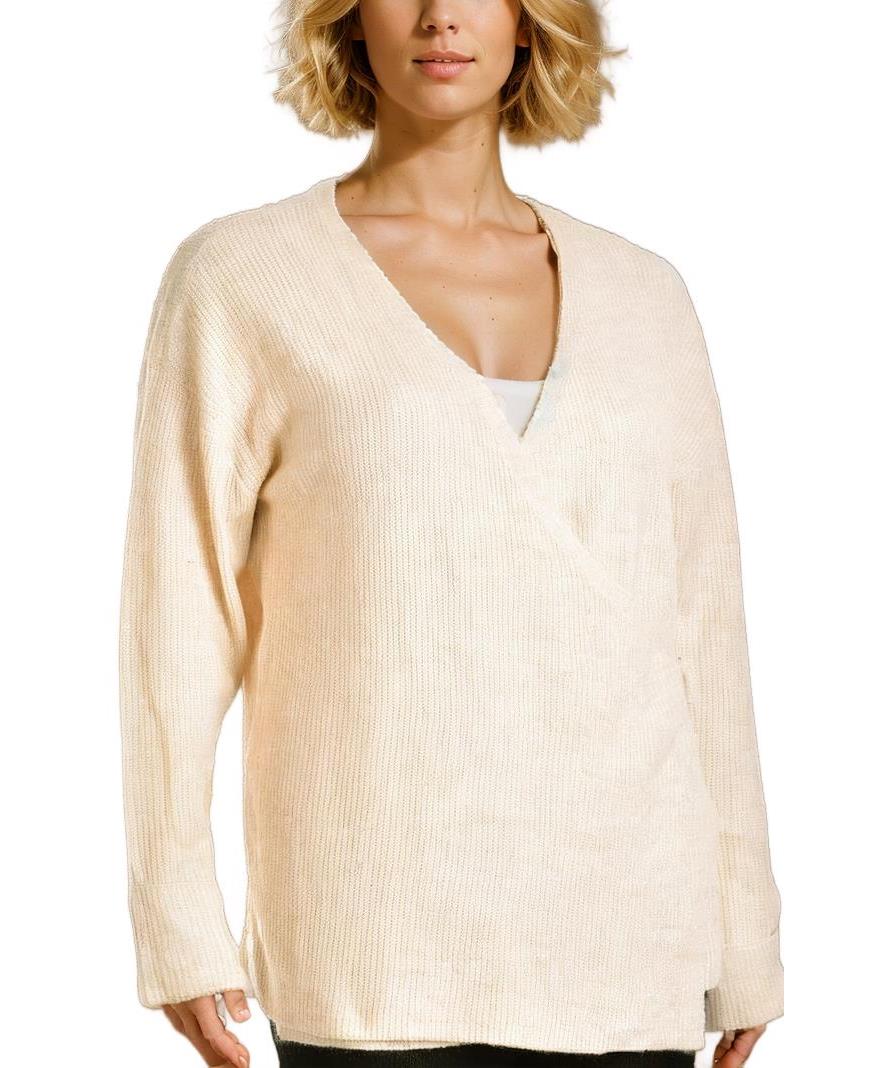 Елегантна дамска жилетка в кремав цвят с V-образно деколте и релефна рипсова плетка. Свободен силует, дълги ръкави и меко докосване — универсална и удобна за всеки ден. Лесна за комбиниране и стилна.