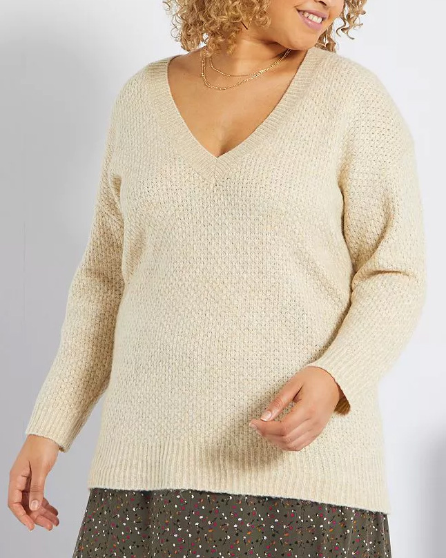 Класически дамски пуловер в кремав цвят с V-образно деколте, дълги ръкави и фина плетка. Свободна, удобна кройка; топъл и мек, подходящ за всекидневие и лесно комбиниране с поли или дънки.