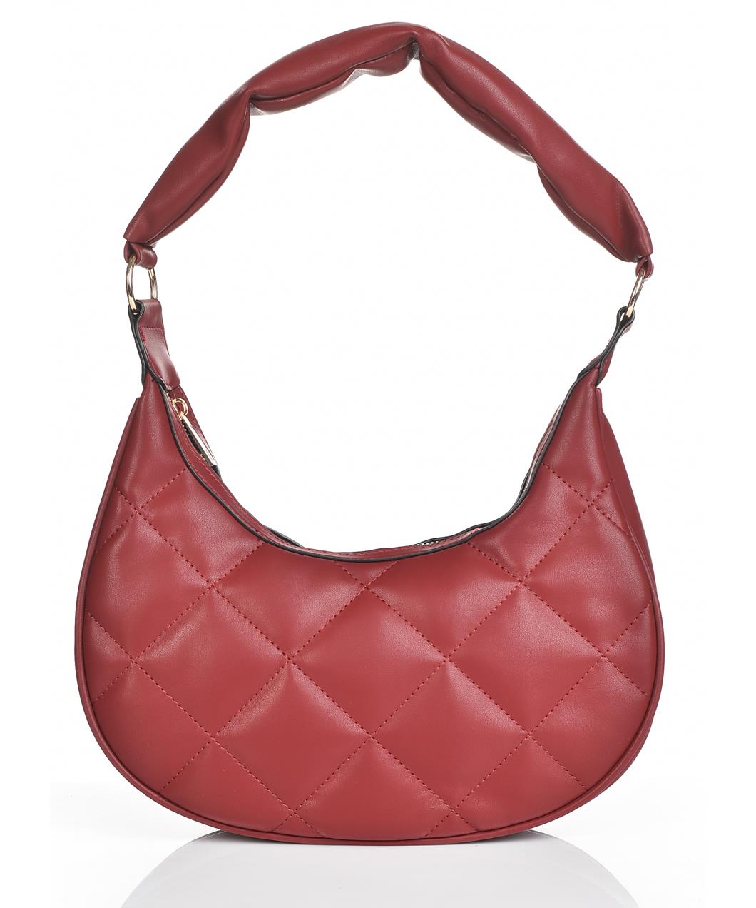 Червена капитонирана чанта полумесец от еко кожа, с подплатена дръжка, цип и златисти детайли. Компактна, практична и стилна - идеална за всеки ден и вечерни изяви Мека подплата и вътрешен джоб с цип...