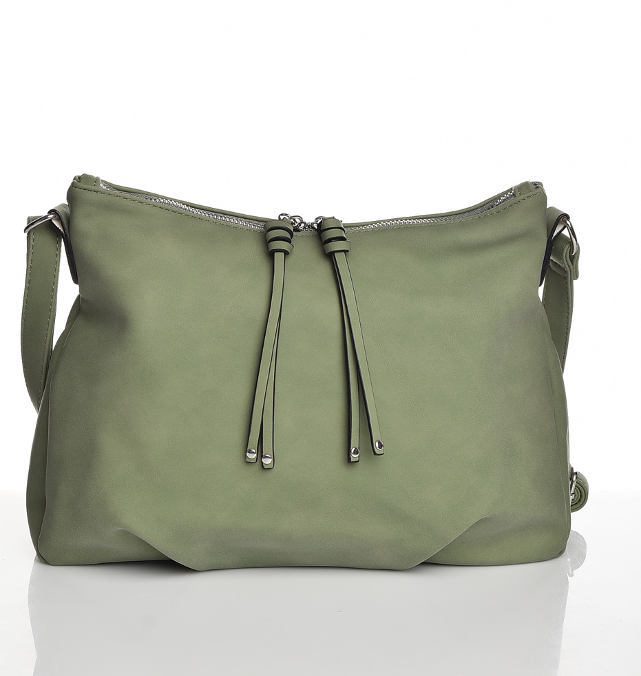 Елегантна ежедневна чанта от еко кожа в маслено зелено. Просторна и лека, с регулируема дълга дръжка, горен цип и стилни метални пискюли. Идеална за градския стил и ежедневни нужди. Вътрешни джобове.