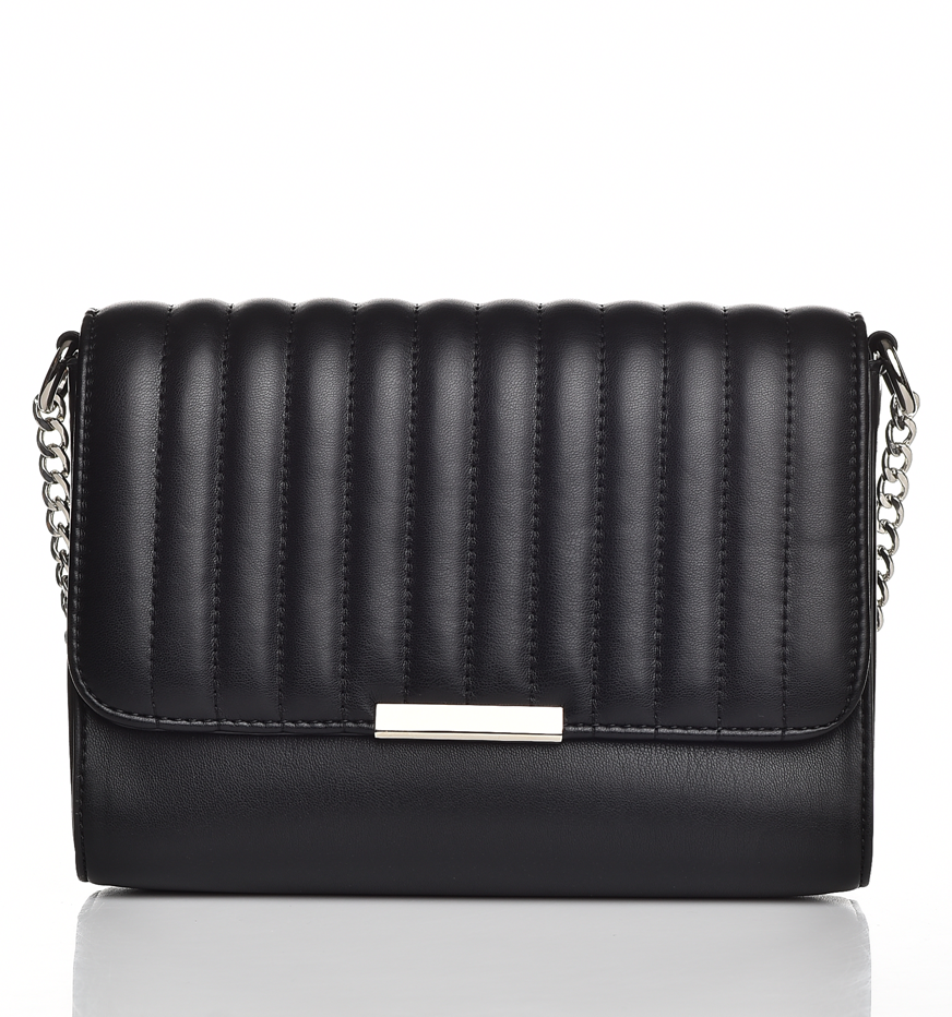 Елегантна дамска чанта от еко кожа, черна с релефни вертикални шевове и метална верижка. Компактна, с магнитно закопчаване и място за телефон, портмоне и ключове. Подходяща за офис, и вечерни събития.