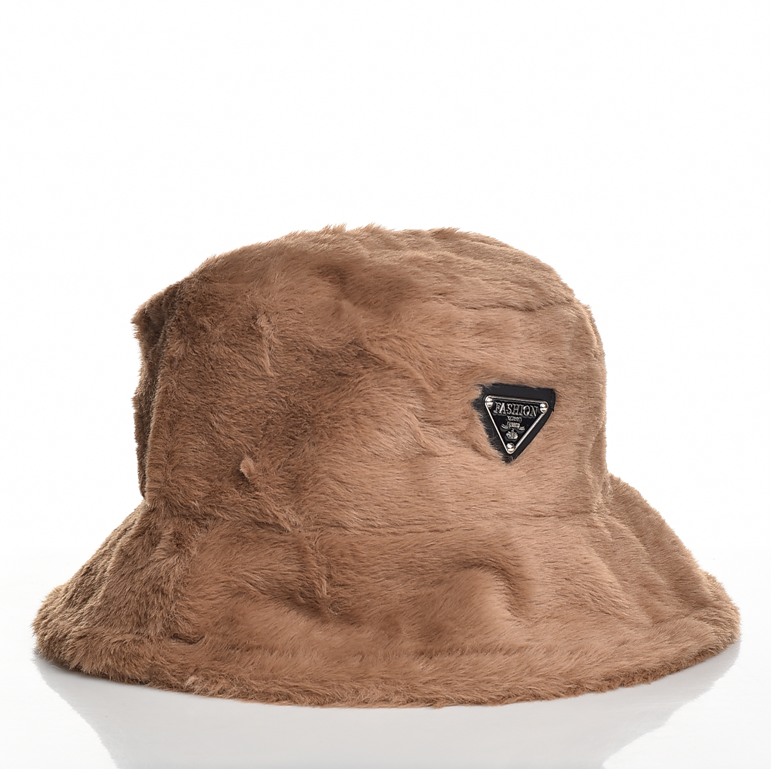 Кафява пухена шапка-кофа от меко изкуствено кадифе. Топла, лека и удобна, идеална за студено време. Дискретна метална емблема добавя модерен акцент. Унисекс модел за ежедневен стил. Стилен подарък за всеки.