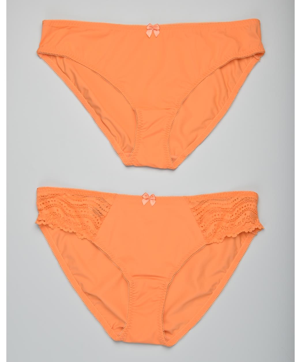 Комплект от 2 дамски бикини в прасковено-оранжев нюанс. Меки, еластични, с деликатни дантелени мотиви и малки панделки отпред. Комфортна кройка за всекидневно носене, приятни на допир.