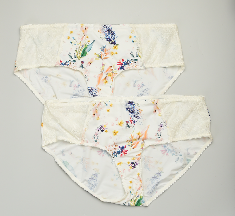 Комплект от 2 дамски бикини с нежен флорален десен и деликатна дантела. Мек, еластичен плат, комфортна кройка и средно покритие. Подходящи за всекидневно носене и подарък. Машинно пране 30°C, деликат.