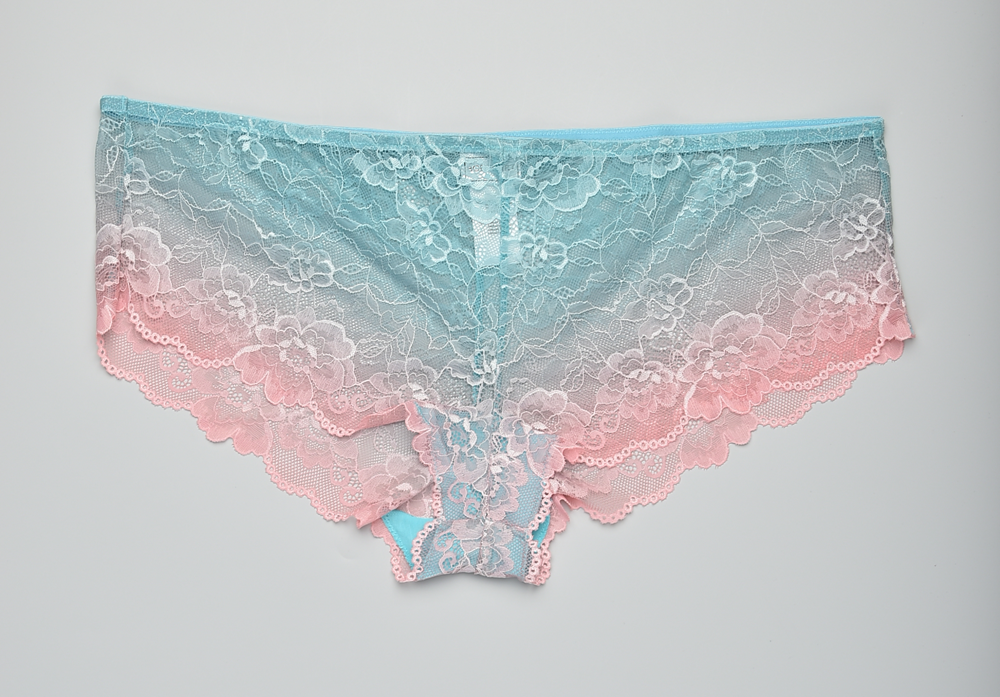 Секси дантелени бикини с нежна цветна дантела в омбре от тюркоаз до прасковено розово. Фин ръб с вълнообразен кант, меко покритие и дискретна централна декорация. Удобни и женствени. Подходящи за плаж