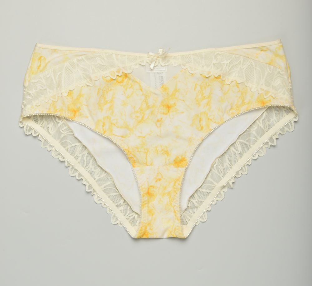 Нежни бикини в кремаво-жълта акварелна шарка, средна талия, фина дантела по краищата и малка панделка отпред. Меки, дишащи, удобни за всекидневна употреба и романтичен вид. Перфектни за летен гардероб.