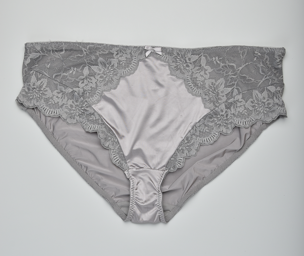 Елегантни бикини в сиво-сребрист нюанс с копринен преден панел и деликатна дантела по талията. Мек плат, комфортна кройка и малка декоративна панделка за финален акцент. Подходящи за всеки ден. Секси.