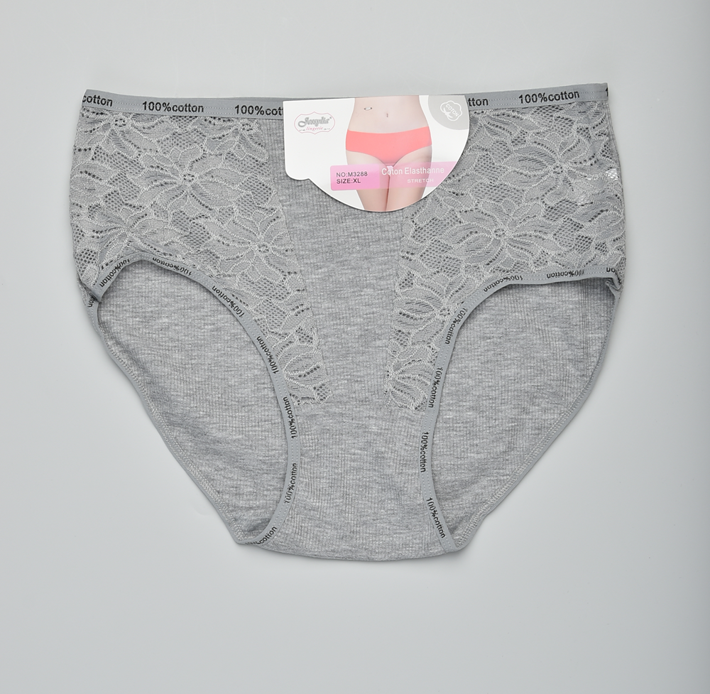 Сиви дамски бикини от 100% памук с декорация от дантела отпред. Висока талия, мека подплата, еластични ластици и дишащ плат за целодневен комфорт. Подходящи за машинно пране. Леко, приятно на тялото.