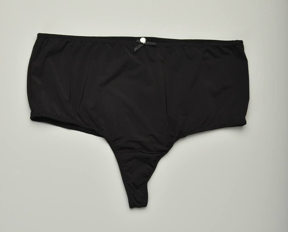 Черни бикини с висок колан и тясна прашка, изработени от еластична, гладка материя за комфорт и перфектно прилягане. Малка панделка отпред добавя елегантна детайлност. Подходящи за всеки ден и вечер..