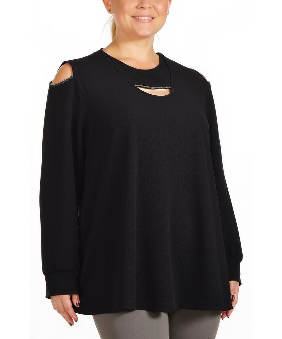 Елегантна дамска блуза в черно, свободен силует с дълги ръкави, отворени рамене и дискретно разрезче отпред. Мека, удобна материя, подходяща за ежедневие и неформални срещи. Подходяща за всеки сезон.