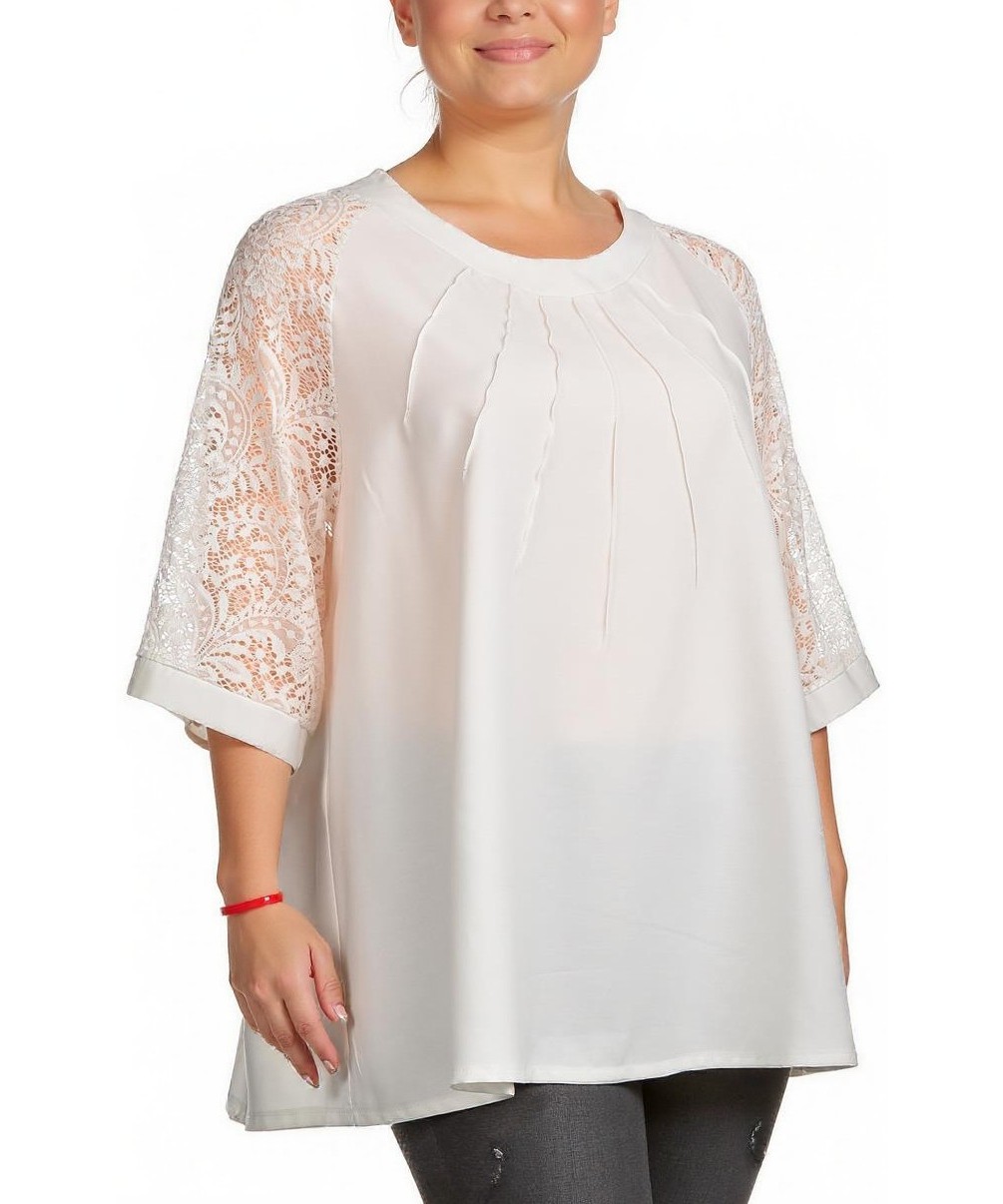 Елегантна дамска блуза от вискоза с широк силует, кръгло деколте и финни плисета отпред. Ръкавите са от дантела с лек обем — нежна и удобна за всеки ден и официални поводи. Подходяща за пролет и лято.
