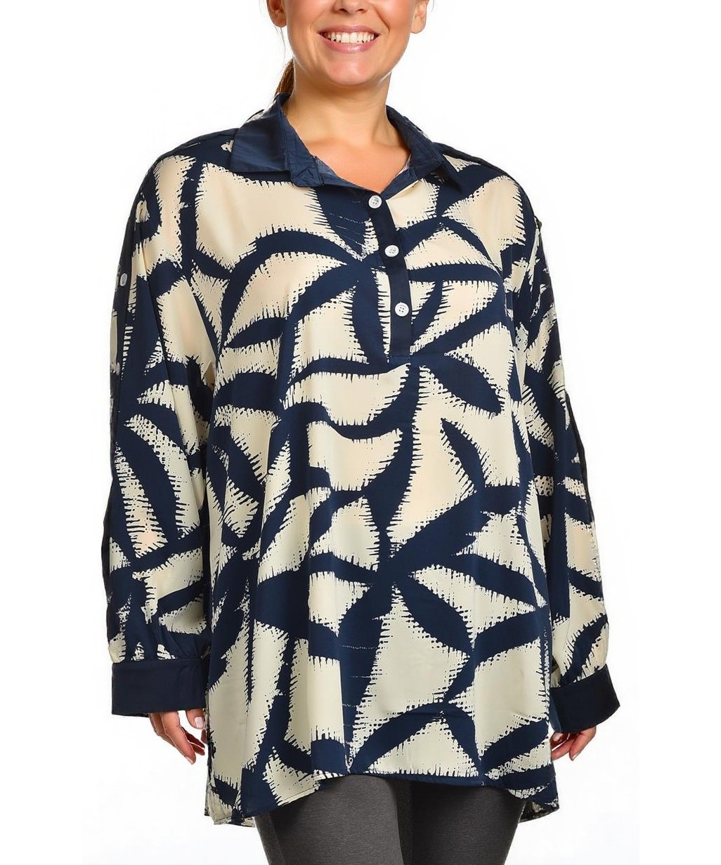 Свободна дамска блуза с дълги ръкави, якичка и 3 копчета. Шарка в тъмносиньо и кремаво, лек силует, удобна и елегантна за ежедневие и по-оформени поводи. Комфортна, лесна за съчетаване. Отличен избор.