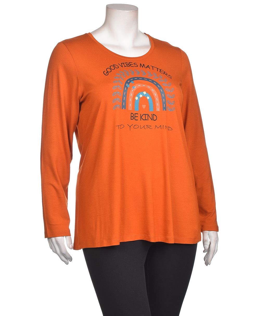Дамска блуза от вискоза в ярко кехлибарен нюанс, с дълъг ръкав и кръгло деколте. Мека, лека и приятна на допир, с цветен райе-принт и позитивен надпис. Подходяща за ежедневно носене. Стилна и удобна .