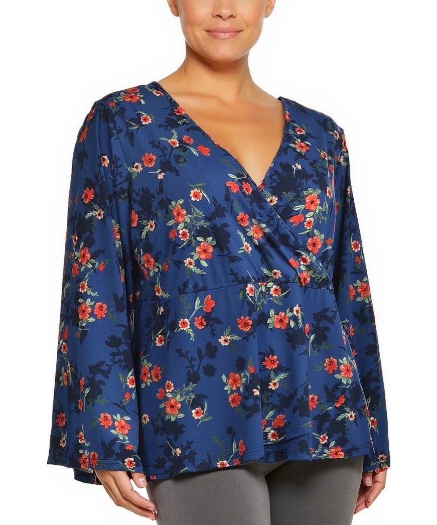 Дамска блуза в тъмносиньо с цветен принт, дълги ръкави и V-образно деколте с прехвърлящ ефект. Лека, приятна материя, оформена талия за по-женствен силует. Подходяща за ежедневие и офис Лесна за пране