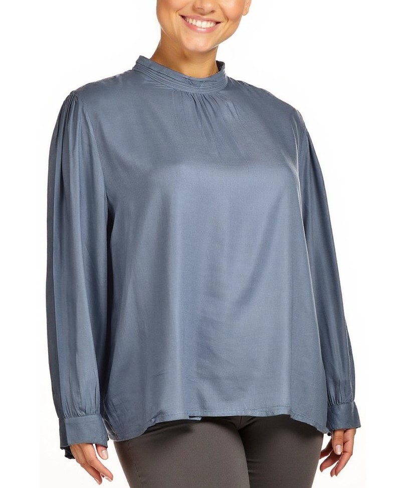 Елегантна дамска блуза от вискоза в прашносин нюанс, със свободен силует, висока права яка и дълги маншетни ръкави. Мека, дишаща материя, лесна поддръжка, подходяща за всеки ден. Стилна и универсална.