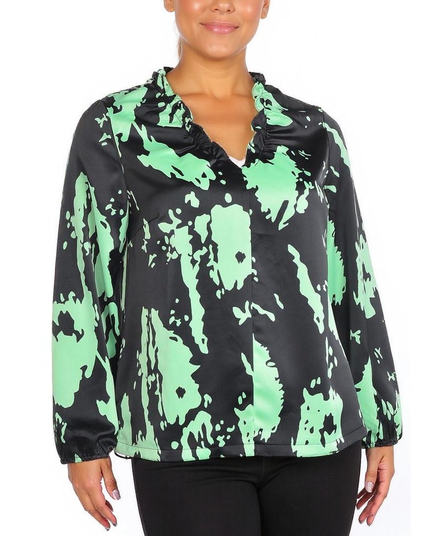 Елегантна дамска блуза с изразителен черно-зелен абстрактен принт, копринен блясък, деликатна драперия на деколтето и дълги ръкави с ластик. Свободна кройка, подходяща за офис и градски стил. За всеки