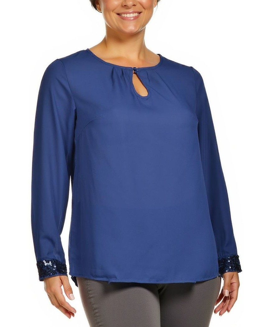Елегантна дамска блуза в кралско синьо с дълги ръкави, цепка на деколтето и дискретни пайети на маншетите. Свободна кройка за комфорт, идеална за офис и вечерни излизания. Лека грижа, фина и елегантна.