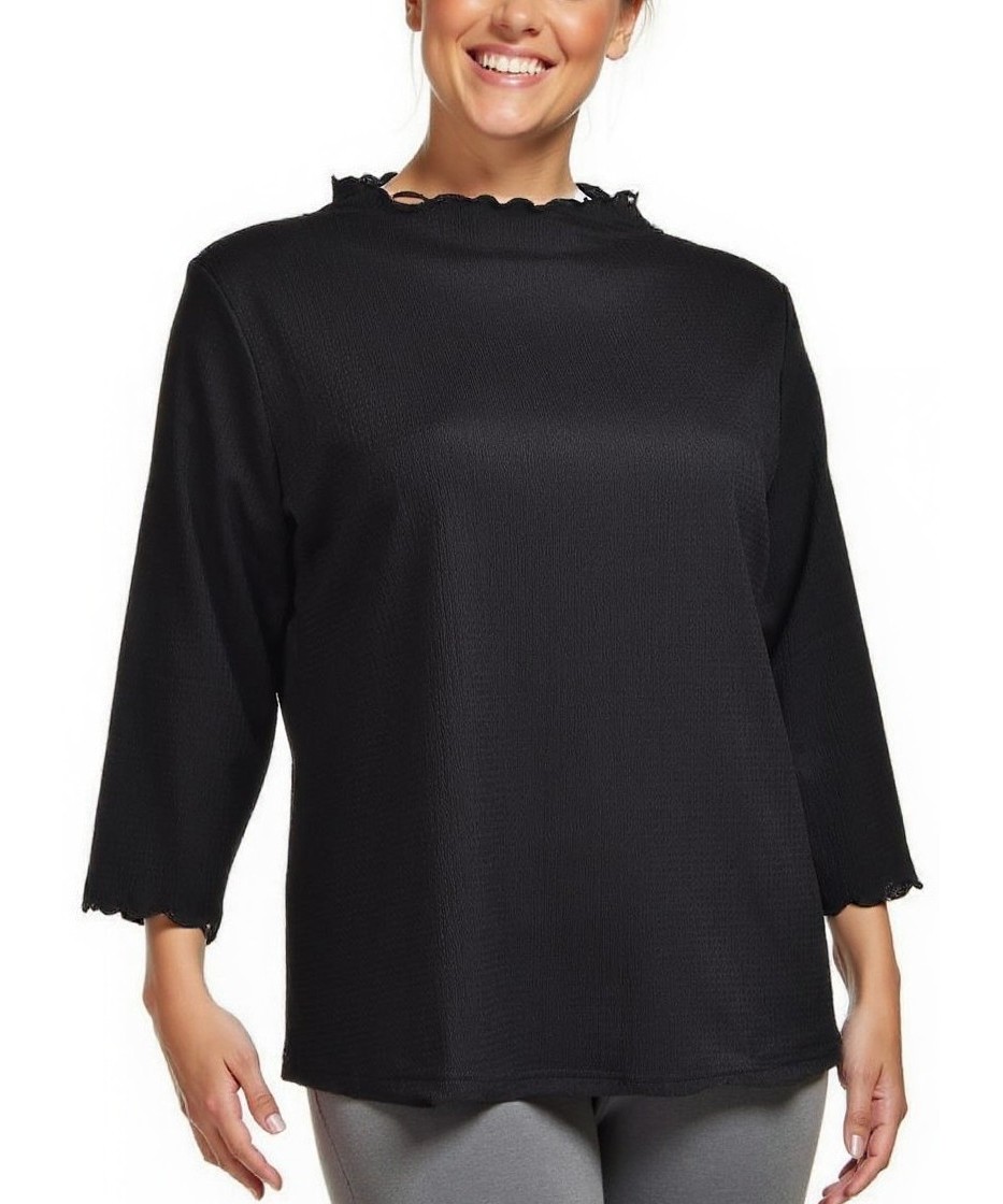 Черна дамска блуза с лек релефен плат, права кройка и три-четвърти ръкави. Деколтето и ръкавите имат фина къдрица за елегантен женствен акцент. Комфортна и подходяща за всеки ден. Лесна за поддръжка.!