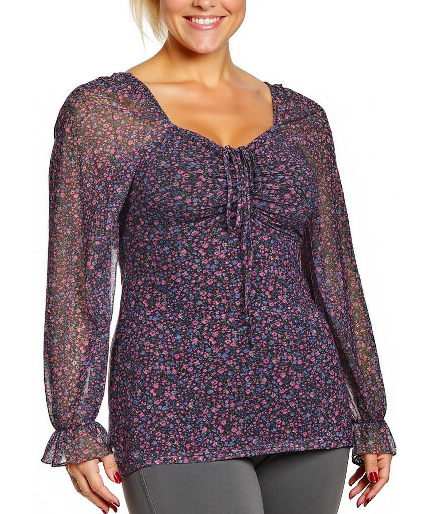Дамската блуза е с флорален мотив и дълги ръкави от прозрачна материя, които завършват с леки волани. Основата е с черен фон, обсипан с цветя в розови и сини тонове. Приляга по тялото и има ефектни детайли отпред. Идеална за елегантна визия.