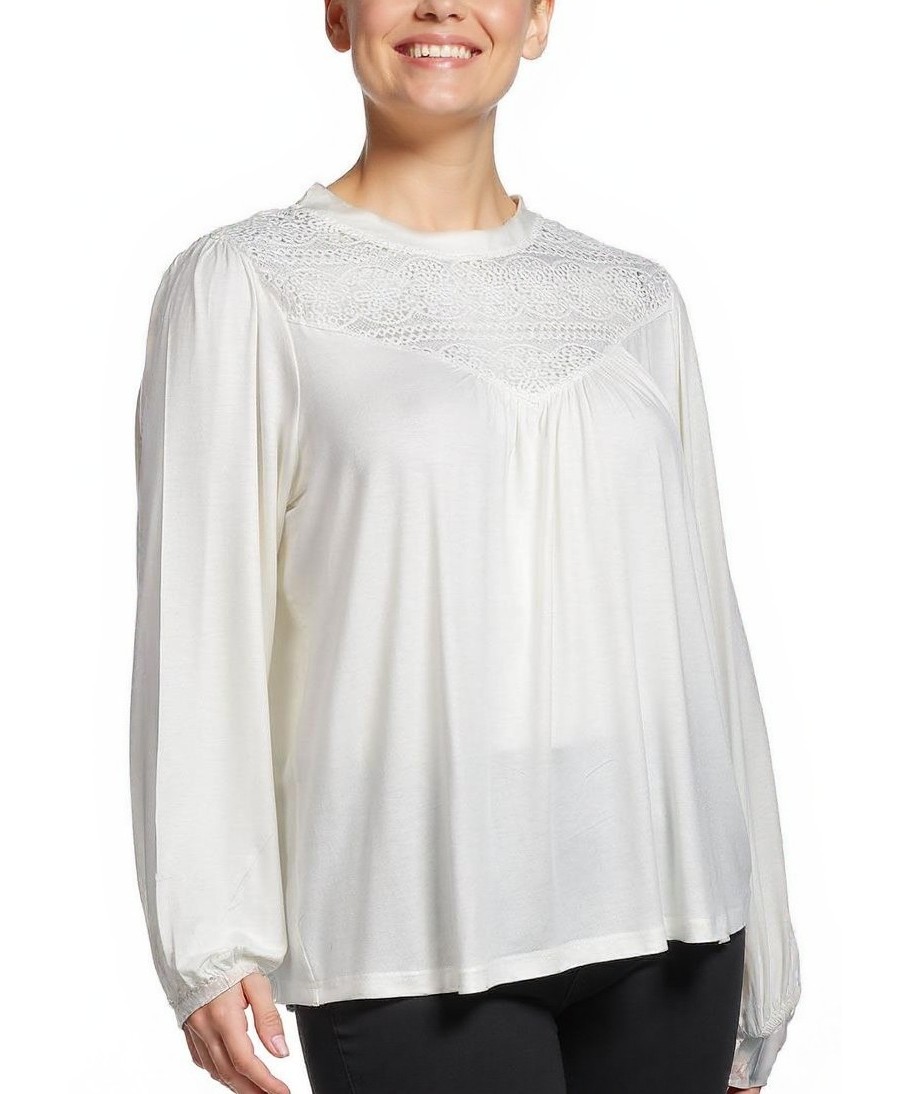 Елегантна дамска блуза от вискоза в кремаво-бяло. Мека и дишаща материя, свободна кройка, дълги зефирни ръкави, дантелено деколте с фини набори. Подходяща за офис и всеки ден. Перфектна за офис и град
