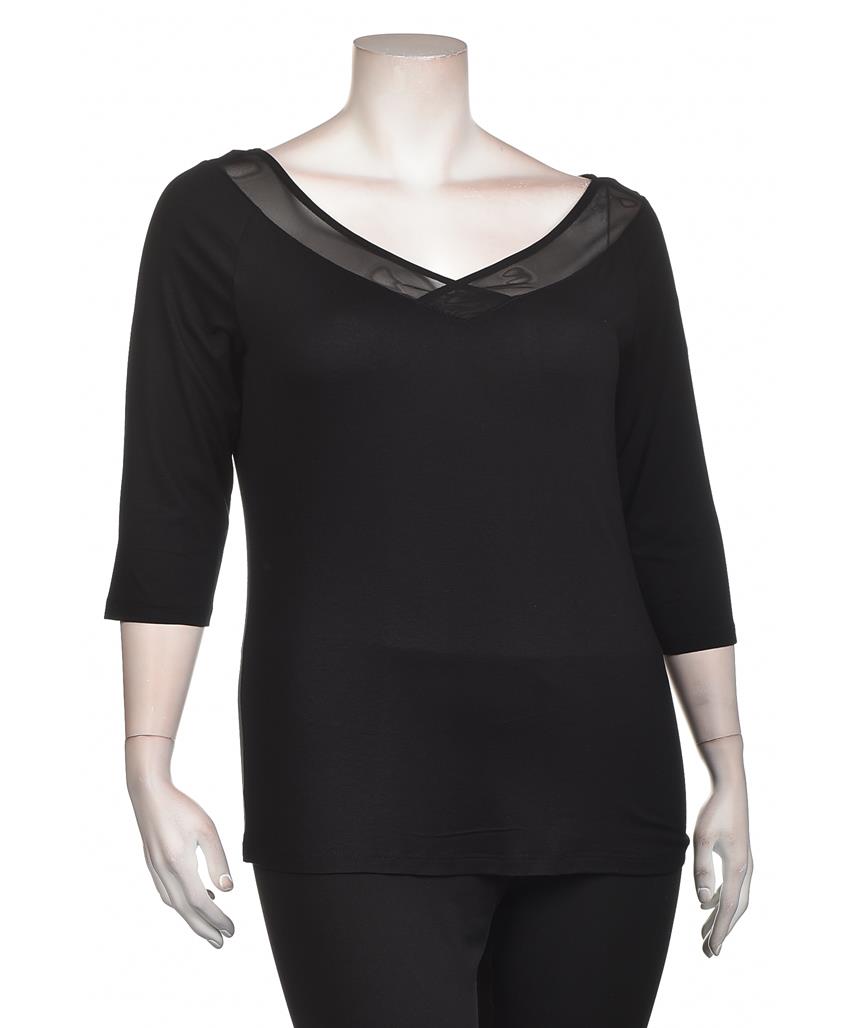 Дамска блуза от вискоза в класическо черно с ефирна прозрачна V-ламка на деколтето и 3/4 ръкави. Мека и удобна, с права кройка — идеална за всеки ден и по-официални поводи. Комбинира се лесно с дънки.