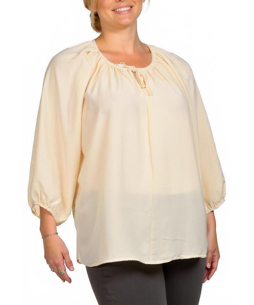 Елегантна дамска блуза в кремав нюанс с мек, лек плат. Свободен силует, 3/4 балонени ръкави, вдигнато деколте с връзки. Универсална за ежедневие и офис, комфортна и стилна. Подходяща за всеки сезон.