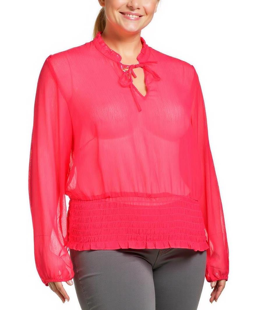 Елегантна дамска блуза в ярък циклама. Полупрозрачен шифон с дълги ръкави, воланена яка и връзка, еластична набрана талия. Лека, подходяща за ежедневни и празнични визии. Идеална за дънки и официални.