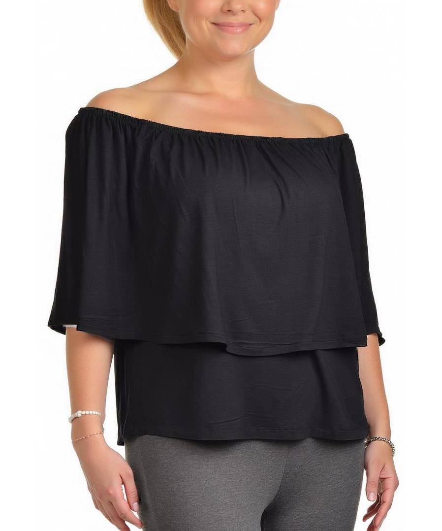 Дамска блуза с отворени рамене, изработена от висококачествена вискоза. Дизайнът е елегантен и модерен с падащи ръкави. Комфортна и стилна, идеална за ежедневна и официална употреба. Цвят: черен.
