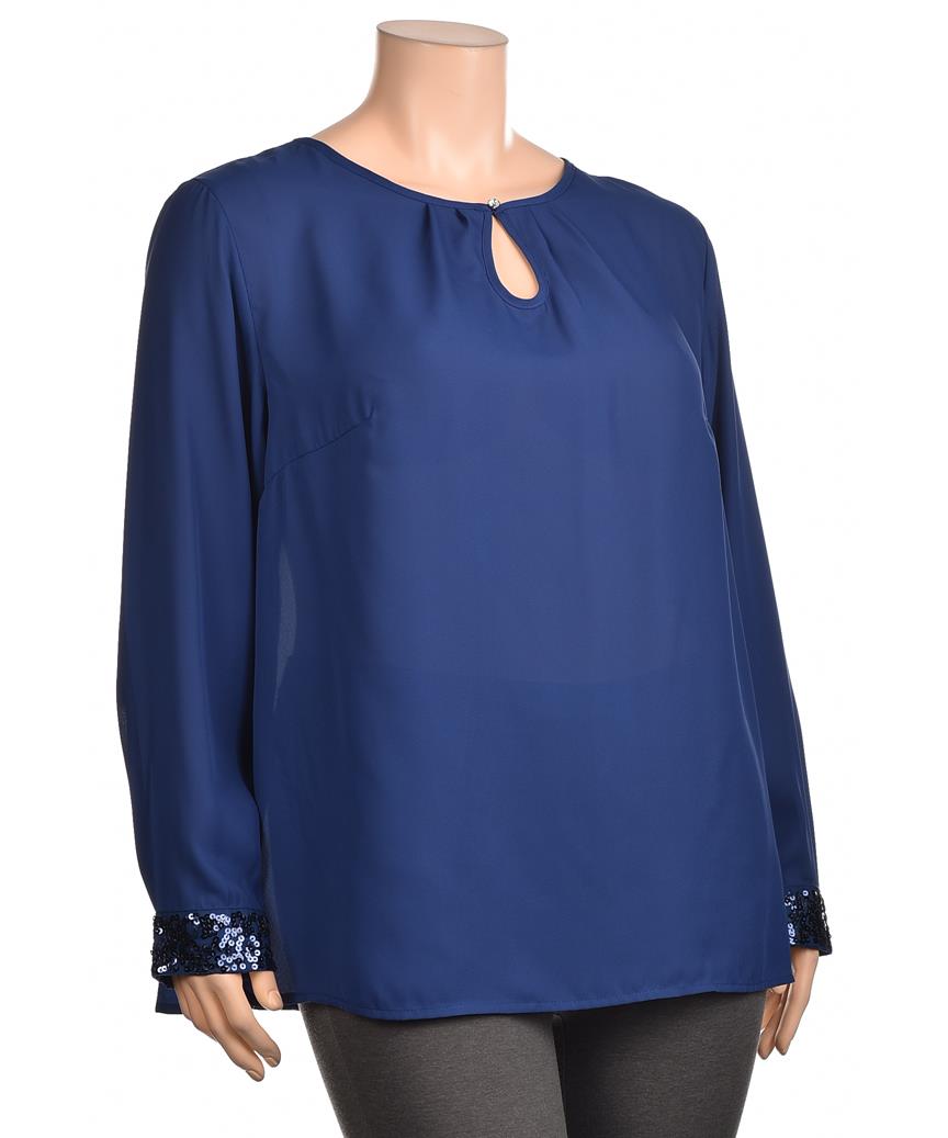 Елегантна дамска блуза в тъмносин цвят с дълъг ръкав и свободна кройка. Деликатен тънък плат, дребна капка деколте с метален детайл и блестящи пайети на маншетите. Подходяща за офис и официални вечери