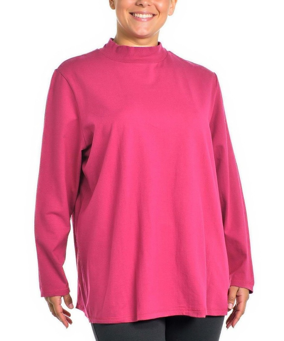 Елегантна дамска блуза в наситено розово, с дълъг ръкав и висока, леко обърната яка. Свободен, удължен силует за удобство и стил, подходяща за ежедневие и по-официални визии. Лека материя лесна грижа.