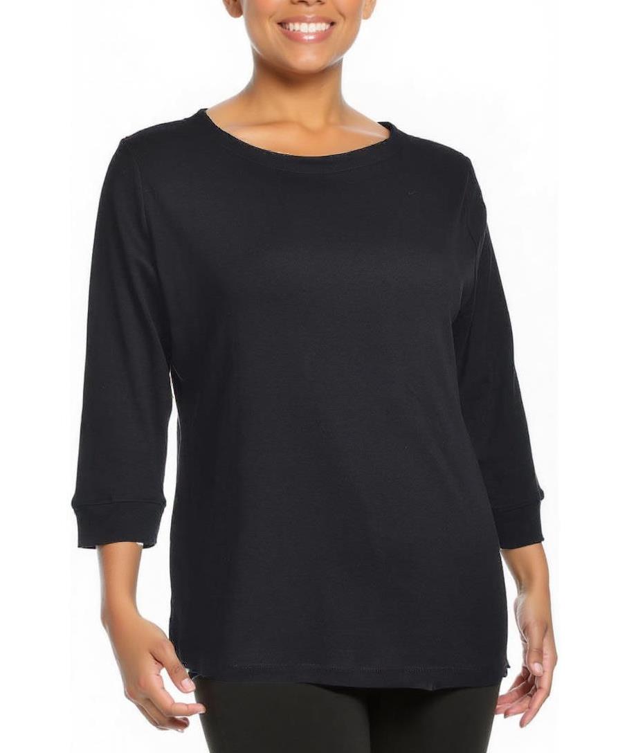 Елегантна дамска блуза от 100% памук в класическо черно. Удобна, мека материя, свободен силует и три-четвърти ръкав. Идеална за ежедневие и офис, лесна за поддръжка. Пералня 40°C. Налични S-M-L-XL-XXL