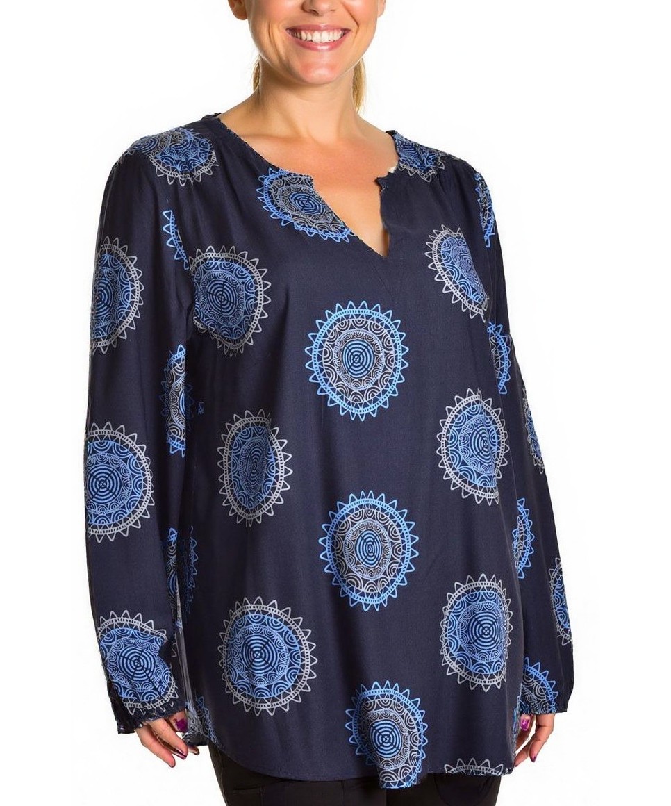 Елегантна дамска блуза от вискоза в тъмносин десен с абстрактни сини кръгове. Свободна кройка, V-образно деколте с цепка и дълги ръкави. Мека, дишаща материя за ежедневен и официален стил. Лесна грижа