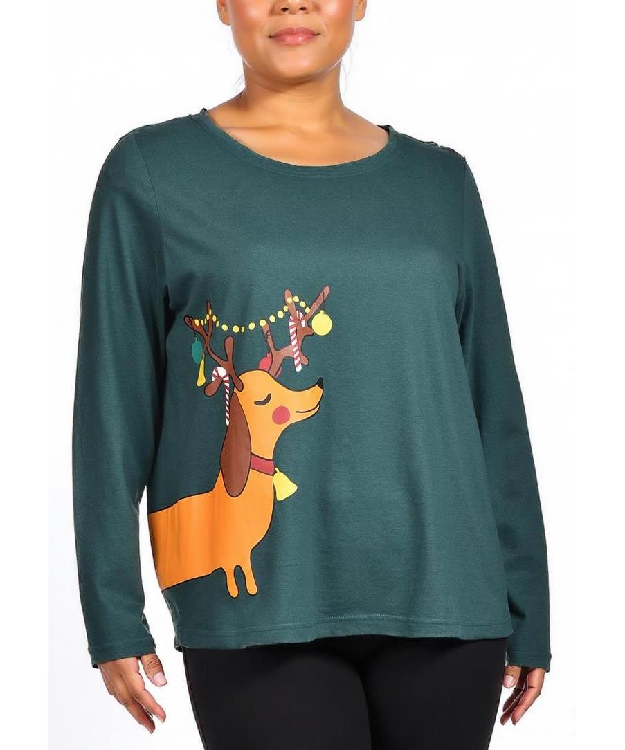 Дамска памучна блуза в тъмно зелено с дълъг ръкав и свободна кройка. Мека и дишаща, с коледен принт на куче с рога и весели орнаменти. Идеална за уютни зимни дни и свободно носене. Със запазена форма.