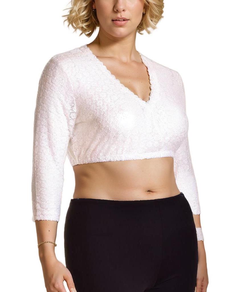 Елегантна дамска къса блуза в бял цвят с V-деколте и 3/4 ръкави. Фина дантела и еластичен подгъв осигуряват удобство и стил, подходяща за официални и ежедневни визии. Лек дишащ материал. Налична в S-XXL.