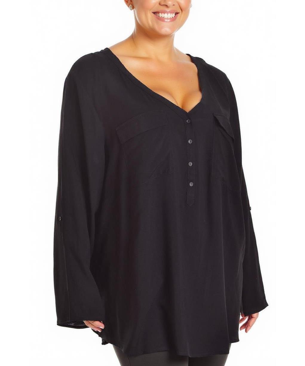Елегантна дамска блуза от вискоза в черно. Свободен силует, дълги ръкави с опция за навиване, V-образно деколте с копчета и фалшиви джобове. Мека, дишаща и подходяща за всеки ден. Лесна за комбинации.