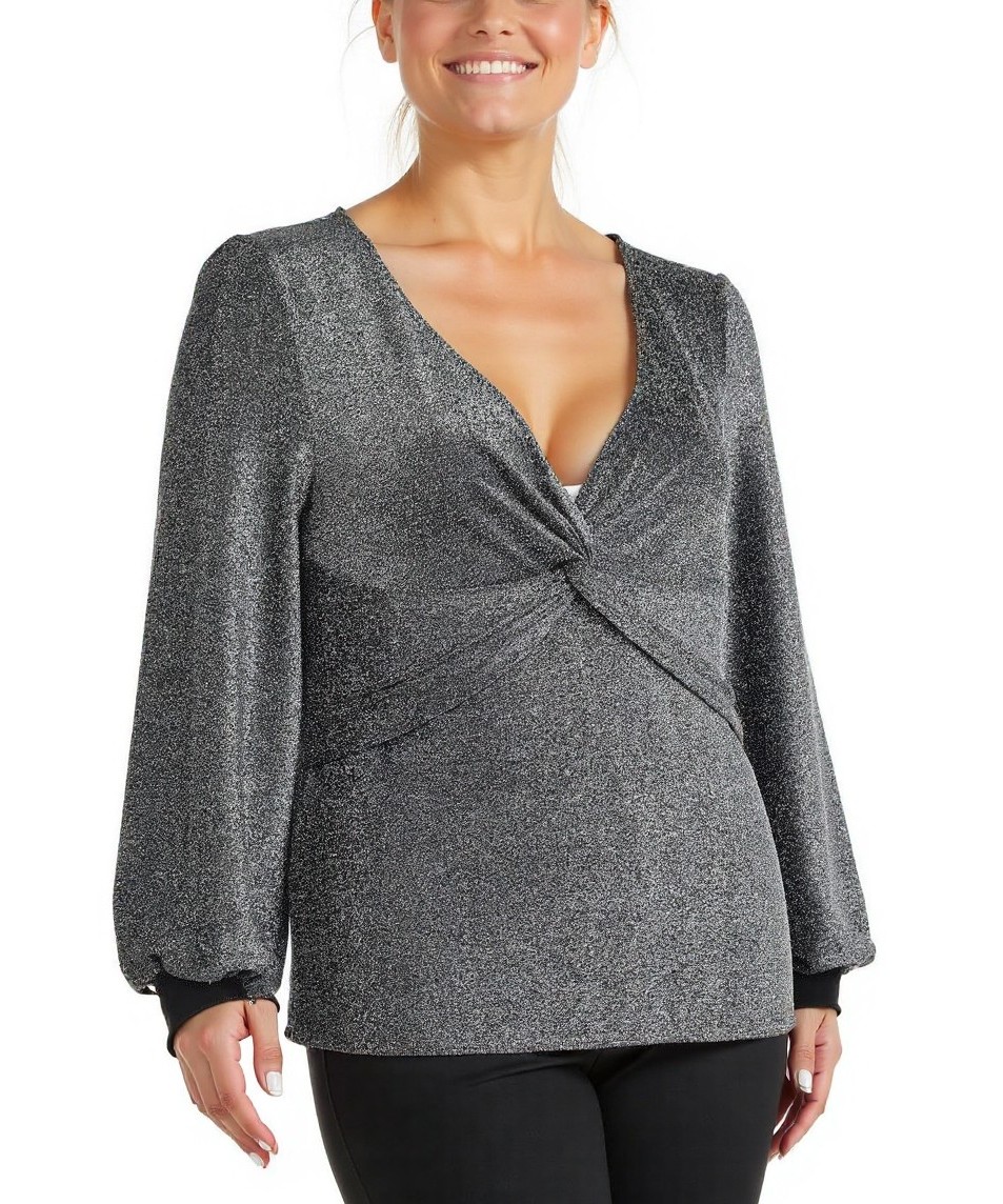 Елегантна дамска блуза от блестяща металик материя с V-образно деколте и усукана предна част. Дълги леко буфан ръкави с маншет, прав и женствен силует, идеална за вечерни изяви.