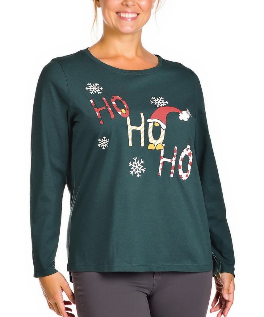 Дамска памучна блуза в тъмнозелено с дълъг ръкав, удобен свободен силует и празничен принт "HO HO HO" със зимни снежинки и шапка. Мека, дишаща, подходяща за ежедневие. Подарък за уют и весел празник.!!