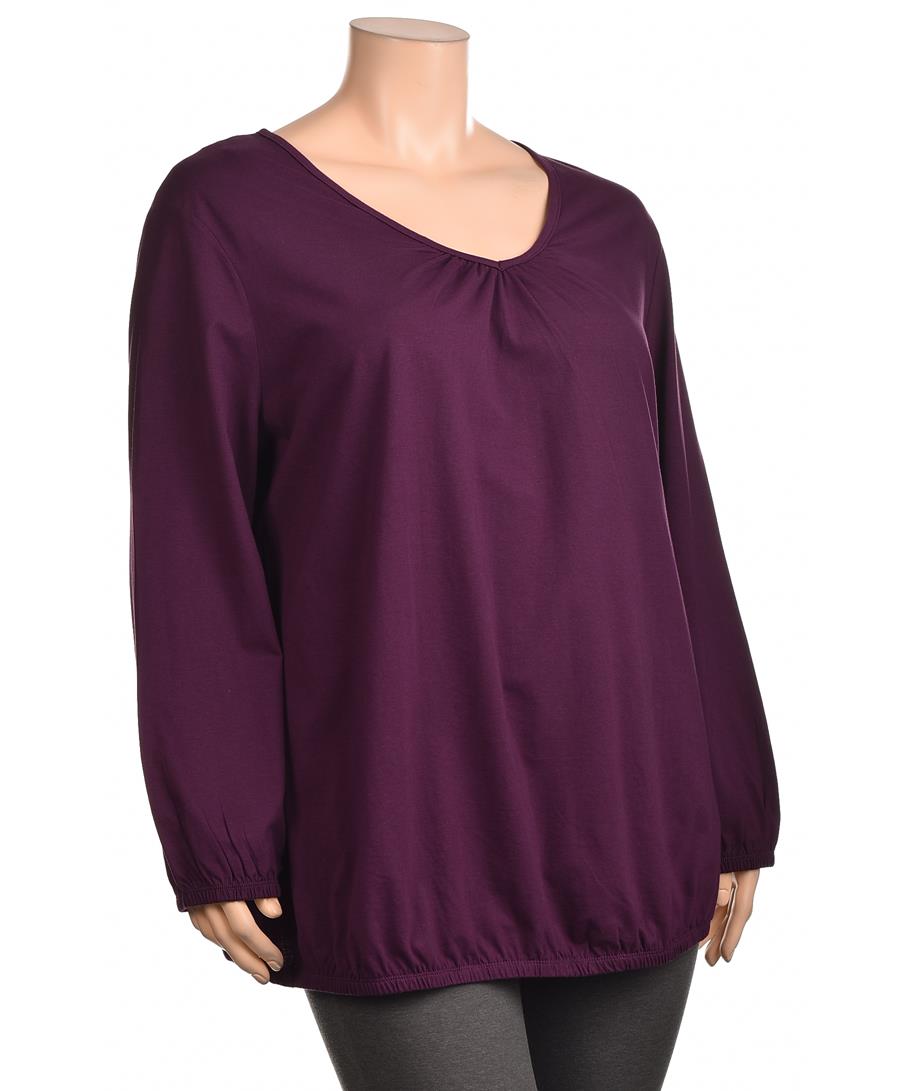 Дамска памучна блуза в тъмно лилаво. Свободен, удобен силует с леко събиране при деколтето, дълги ръкави с ластик и еластичен подгъв. Перфектна за ежедневие и комфорт. Лесна за поддръжка, машинно пране.