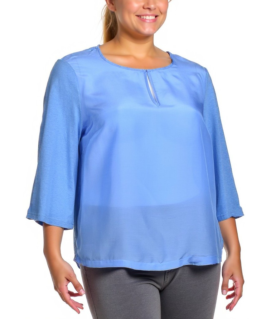 Дамска блуза в небесносин цвят, съчетаваща изчистен дизайн с малък отвор на деколтето. Изработена от лека и удобна материя, с три-четвърт ръкави. Идеална е за ежедневно носене или офис облекло.