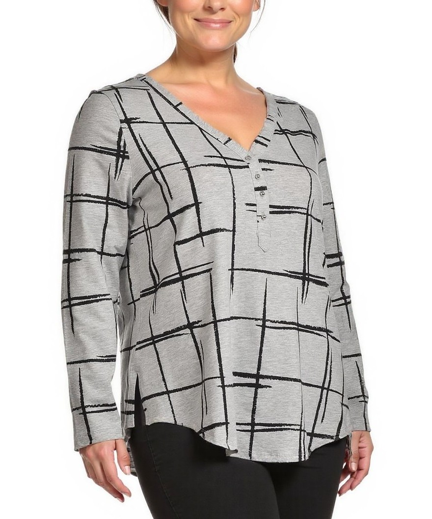 Дамска блуза от памук с модерна графична каре-шарка, V-образно деколте с копчета и дълъг ръкав. Меко, дишащо трико, удобна кройка за ежедневно носене и лесна поддръжка. Нежно изпиране. Налични размери