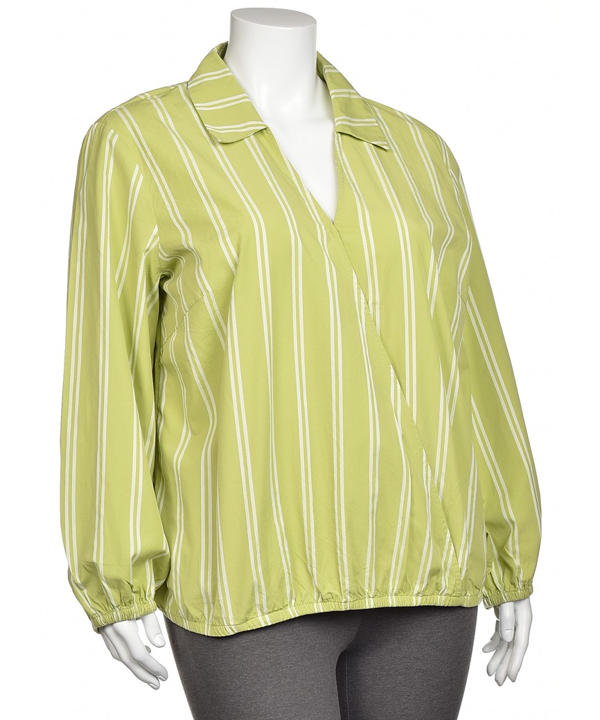 Дамска блуза от памук в светлозелен цвят с вертикални бели райета. Свободен класически силует с V-образно деколте и яка. Подходяща за ежедневието. Предлага комфорт и стил в разнообразни комбинации.