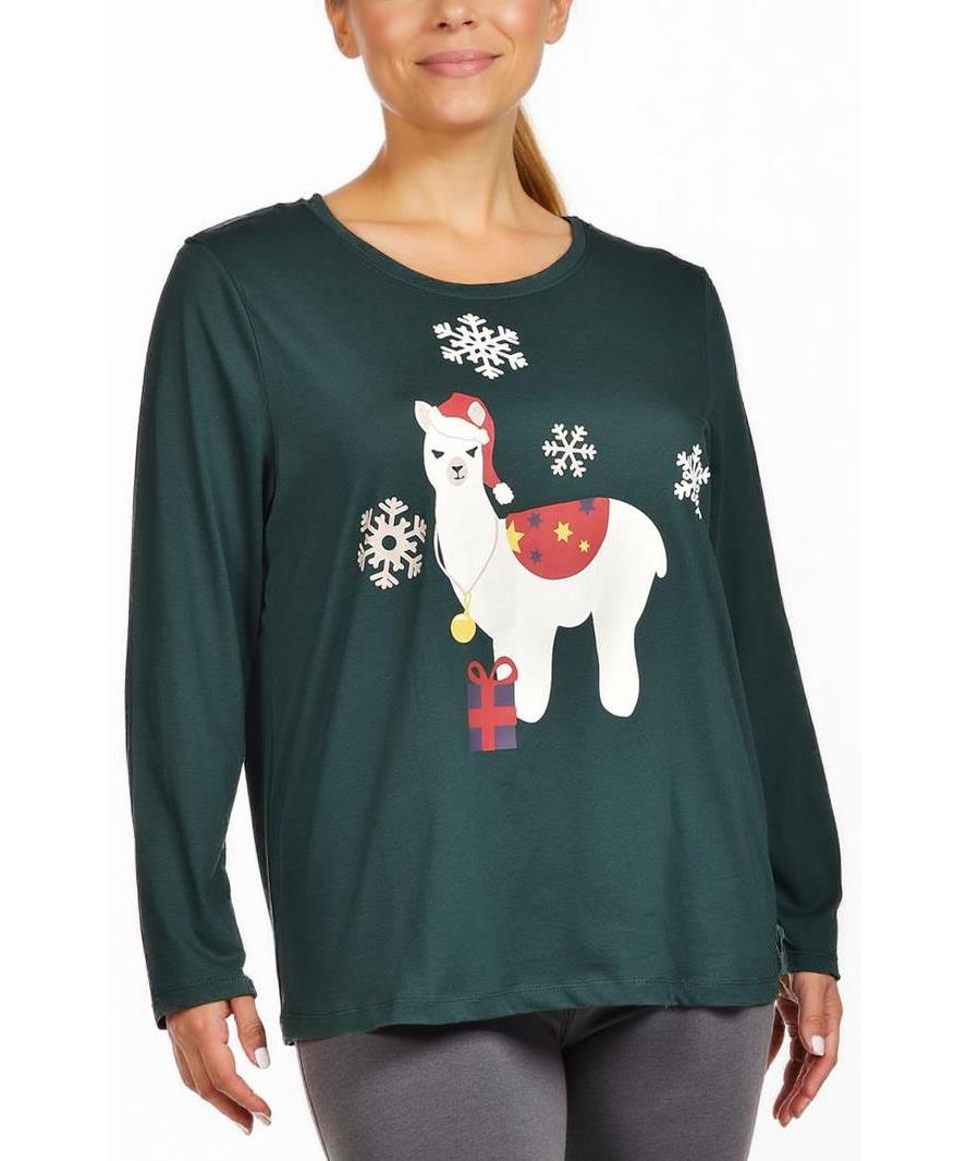 Дамска памучна блуза в тъмно зелено с дълги ръкави, кръгло деколте и забавен коледен принт с алпака, снежинки и подарък. Мека, удобна и подходяща за всеки ден през зимата. Идеална за подарък, приятна.
