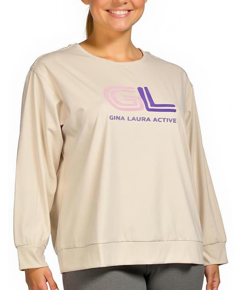 Дамската блуза е в бежов цвят с дълги ръкави. Има обло деколте и е украсена с модерна щампа "GL GINA LAURA ACTIVE" отпред. Материята изглежда комфортна и еластична, подходяща за ежедневно носене.