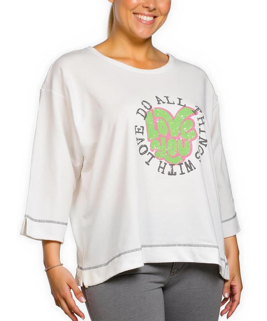 Дамска блуза от мек памук, с модерна кройка и три четвърти ръкави. Декорирана с надпис "DO ALL THINGS WITH LOVE" и цветен принт отпред. Подходяща за ежедневието, комбинира се лесно.