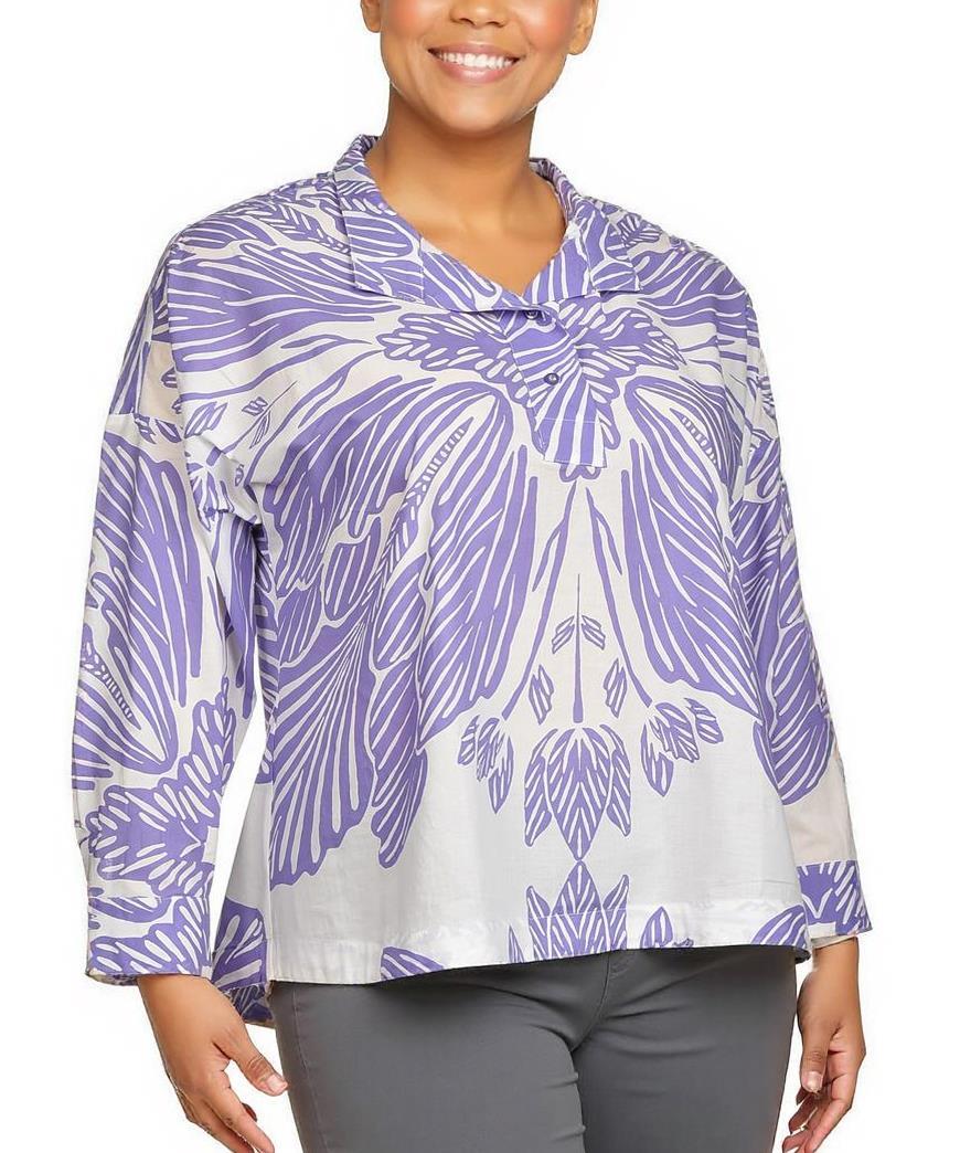 Дамска блуза от памук с дълги ръкави и свободна кройка. Декорирана с големи лилави флорални мотиви на бял фон. Удобна и стилна, подходяща за ежедневна употреба и свободно време.