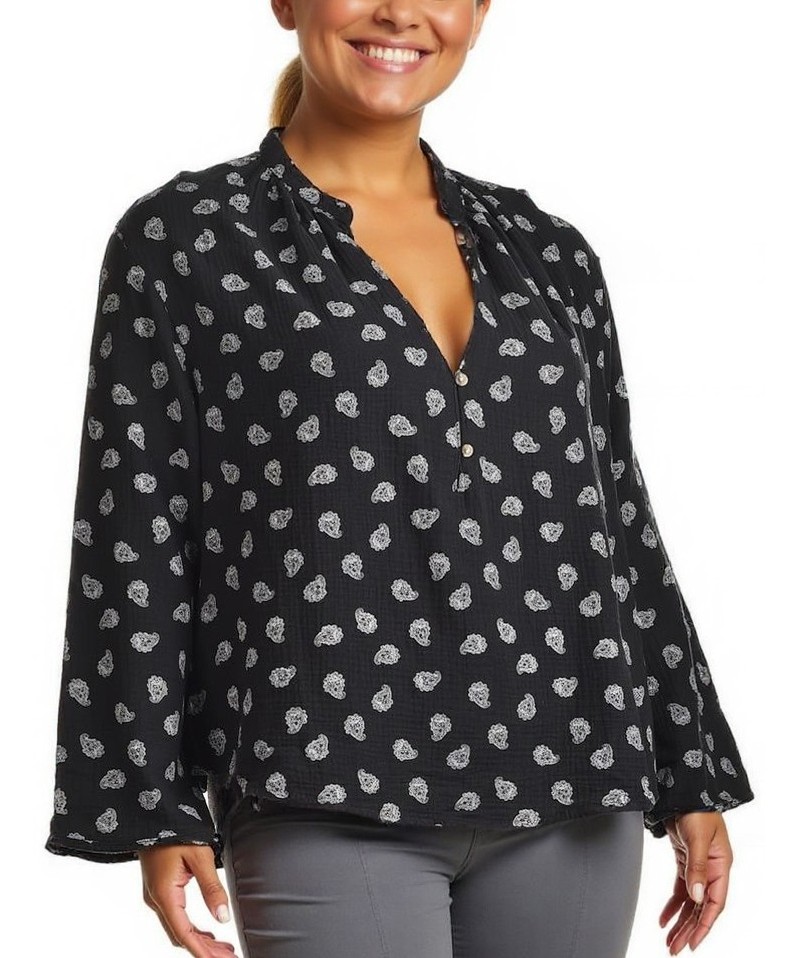 Черна дамска блуза от памук с бели флорални мотиви, V-образно деколте с копчета, дълги ръкави и свободна кройка. Мека, дишаща и удобна за ежедневие и офис стил. Лесна за пране, идеална за всеки ден.