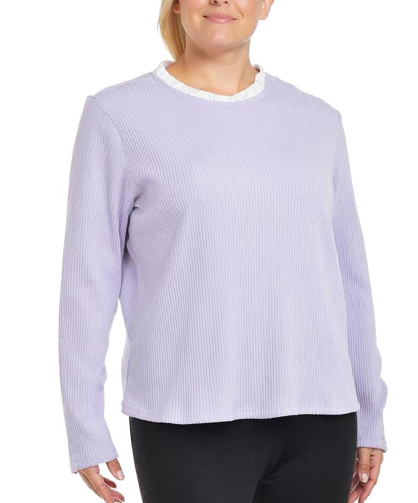 Дамска блуза от памук в нежно лилаво с релефна плетка и дълги ръкави. Прав силует и кръгло деколте с фин волан. Мека, дишаща и удобна за ежедневие и свободно време. Подходяща за офис и разходки. Стил.