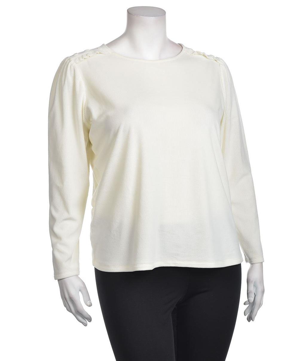Елегантна дамска блуза в кремаво, с кръгло деколте и дълги ръкави. Свободна кройка, мека материя и фини украси на раменете. Подходяща за ежедневна и вечерна визия. Лесна поддръжка комбинира се с дънки