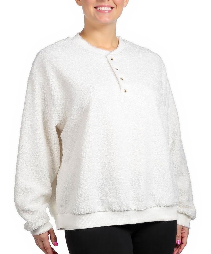 Мека дамска блуза с плюшена фланела, бял цвят, свободна кройка и дълги ръкави. Хенли деколте с копчета, еластични ръкави и долен ръб. Уютна и стилна за ежедневие. Подходяща за разходки и уютни вечери.