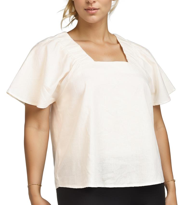Дамска блуза със свободна кройка, изработена от ленена смес и памук. Моделът разполага с къси, широко разкроени ръкави и квадратно деколте. Идеална за ежедневен комфорт и стил в топлите дни.